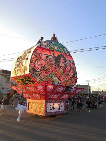 扇形のねぷたの上には人が乗り、掛け声でみんなを盛り上げます。